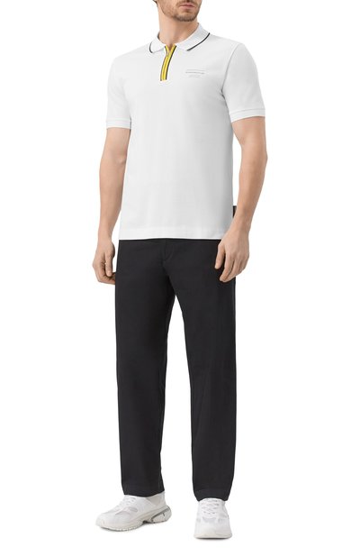 Рифленое поло на трех перламутровых пуговицах выполнили из органического хлопка. Воротник модели и планку украсили контрастными полосами и пунктирным узором.