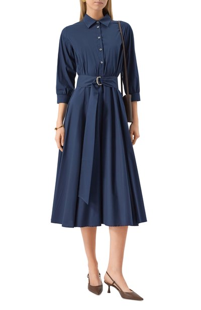 Платье-рубашку со слегка удлиненным сзади подолом, боковыми разрезами и карманами выполнили изо льна. Модель на пуговицах в тон дополнили съемным поясом-лентой.