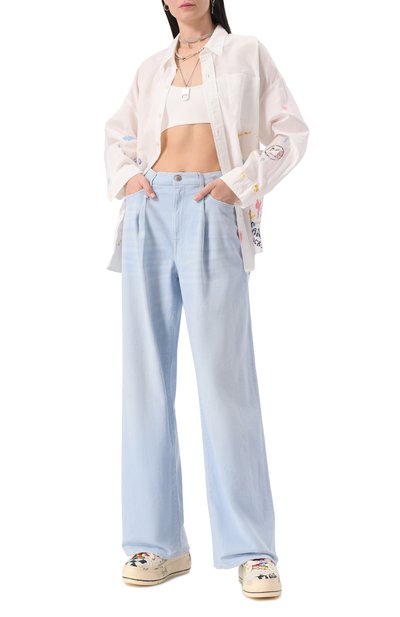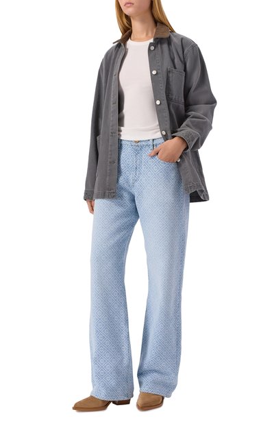 Джинсы из хлопка стрейч украсили искаженным леопардовым принтом, повторив рисунок на баске из тонкой вискозы, ниспадающей по бокам. Модель дополнили карманами, подчеркнув один из них фирменной литерой B.