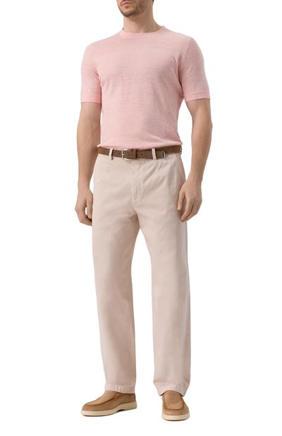 Меланжевая футболка с небольшими боковыми разрезами сшита из джерси на основе шелка и хлопка. Модель с круглым вырезом украшена спереди вышитым логотипом, а сзади — небольшой эмблемой марки.
