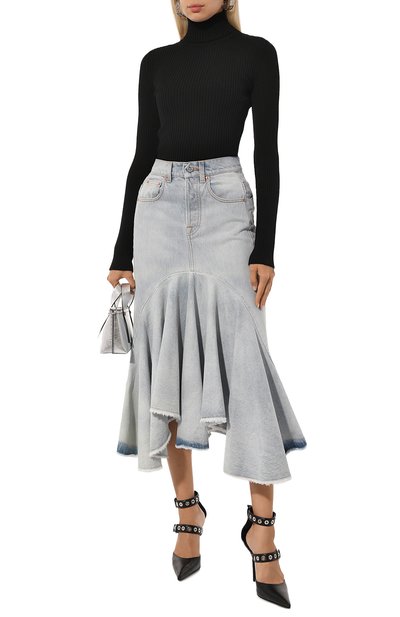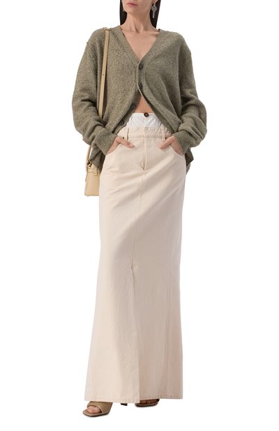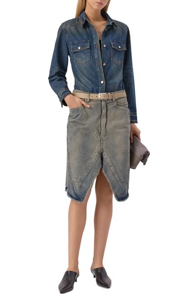 Выбеленную джинсовую юбку с высокими разрезами и необработанными краями дополнили текстильной вставкой, создав иллюзию многослойности. Модель с пятью карманами и фирменными четырьмя стежками сзади выполнили из чистого хлопка.