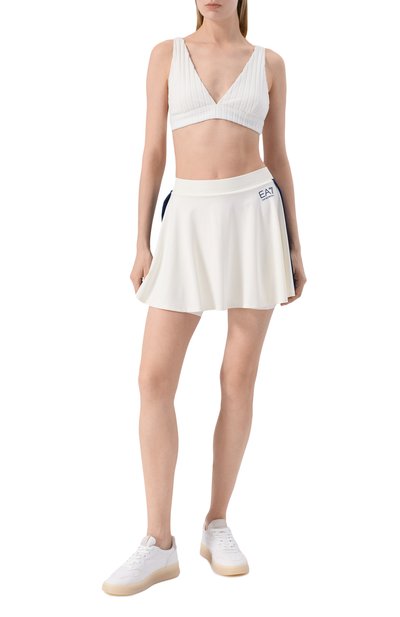 Кроп-топ с глубоким V-образным вырезом и рифленым узором украсили логотипом сзади. Модель с широкими бретелями и поясом сшили из эластичного полиэстерового трикотажа с добавлением вискозы.