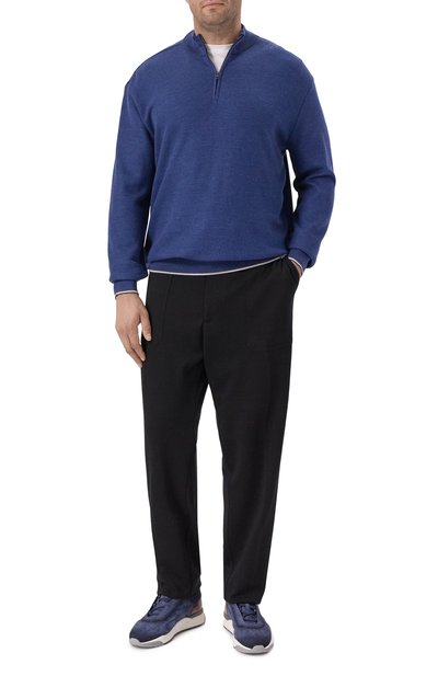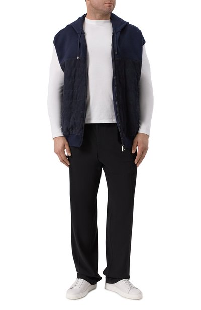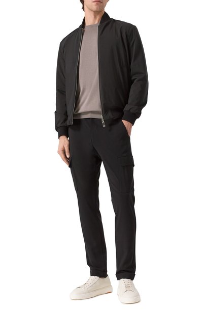 Зауженные брюки с четырьмя врезными карманами и двумя карго сшиты из эластичной шерсти. Модель с поясом-кулиской и отворотами дополнена фирменным брелоком с маской Пульчинеллы.