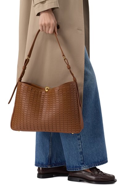 Сумку на текстильном подкладе-мешке, дополненную внутренним карманом, сплели из соломки. Ручку аксессуара и съемный регулируемый ремень выполнили из кожи. Спереди на модели расположили нашивку с фирменной пятиконечной звездой.