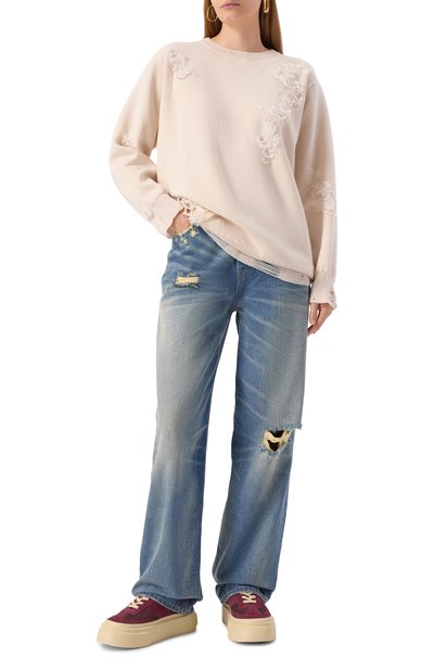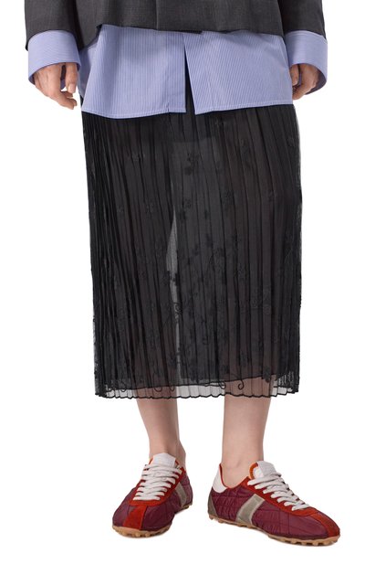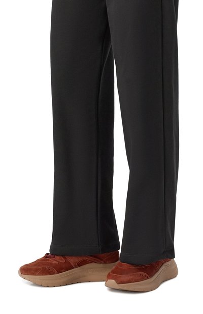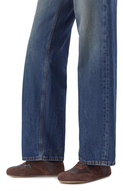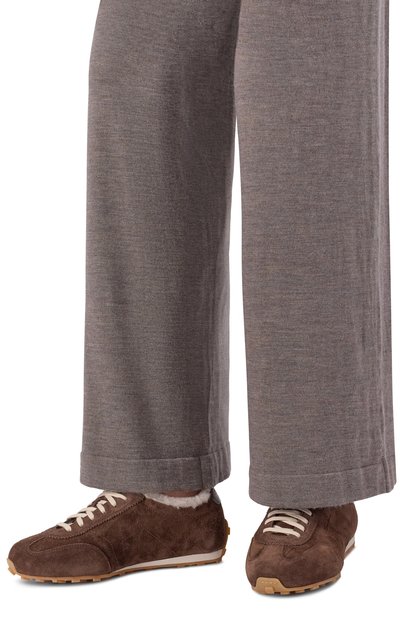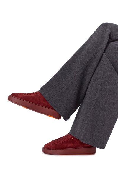 Кроссовки с фирменным перфорированным мотивом Double-buckle по бокам украсили логотипами на язычке и заднике из кожи, окрашенной в фирменной технике velatura. Модель из замши установили на гибкую подошву с шипованным протектором, заходящим на пятку.