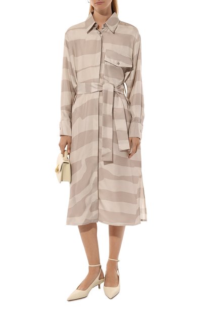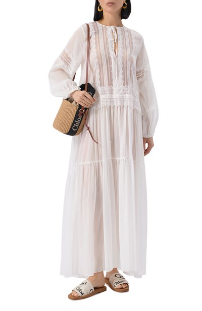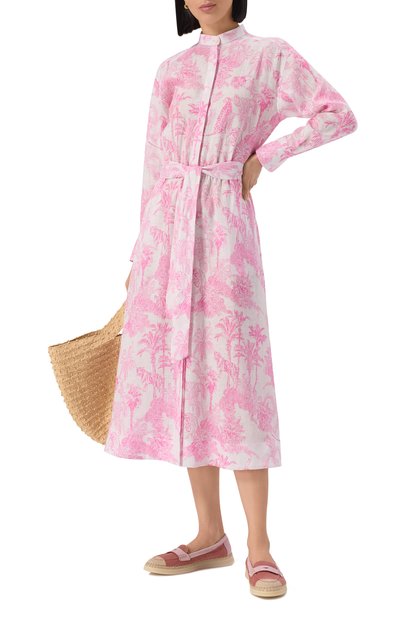 Платье Summer Lovers со спущенной линией плеч сшили из хлопковой ткани с брендированным паттерном и бенгальской полоской. Модель без застежки, с широкими отворотами на рукавах кимоно дополнили поясом-лентой.