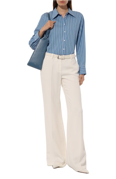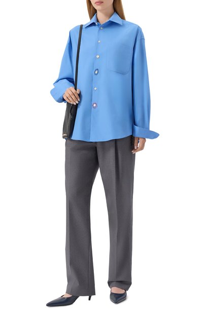 Для пошива рубашки со складками на спинке, фигурным низом и широкими манжетами использовали габардин из шерсти первого пострига. Модель с крупными пуговицами дополнили накладными нагрудными карманами с клапанами.