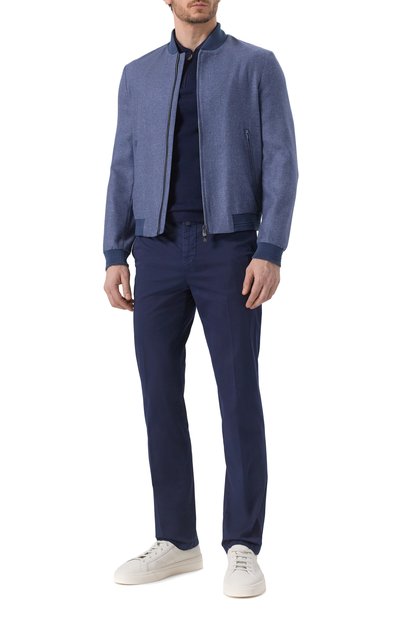 Для создания поло Cashmilo использовали хлопковый трикотаж с добавлением шелка и кашемира. С узким контрастным кантом на манжетах в рубчик зарифмовали полосатую вставку на планке с пуговицами.