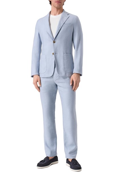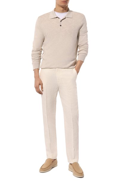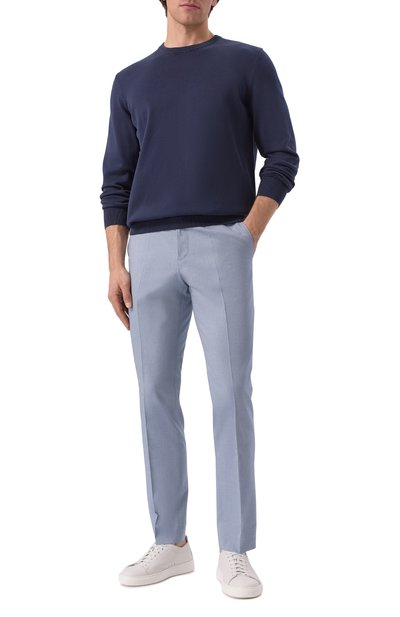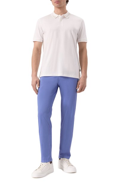 Брюки с проглаженными стрелками выполнили из стрейчевого хлопкового твила. Модель с билетным, двумя боковыми и парой задних карманов украсили вышитой эмблемой и фирменным патчем.
