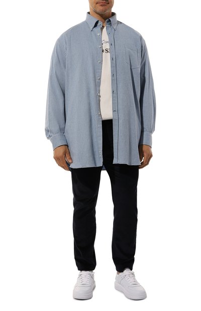Рубашку на перламутровых пуговицах изготовили из хлопкового поплина в полоску, а отложной воротник и манжеты — из такого же однотонного материала. Нагрудный карман модели украсили брендированной вышивкой Bristol Crest.