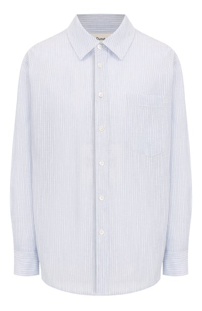 Рубашку с бантовой складкой на спинке с кокеткой выполнили из полупрозрачной хлопковой ткани в жаккардовую полоску. Накладной нагрудный карман украсили вышитой в тон эмблемой марки.