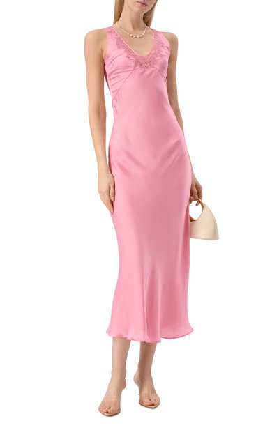 Платье с узкими регулируемыми бретелями и потайной молнией на спинке украсили многоярусной бахромой. Модель из полупрозрачного шифона оттенка Alba in Arizona дополнили нижним платьем.