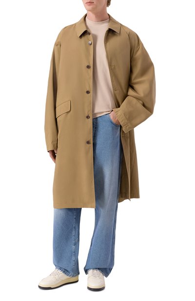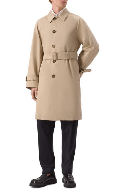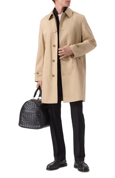 Плащ с высокой шлицей и супатной застежкой дополнили внутренним и внешними боковыми карманами. Для создания модели использовали хлопковый материал, укрепленный нейлоном.