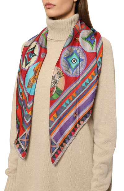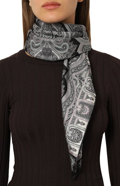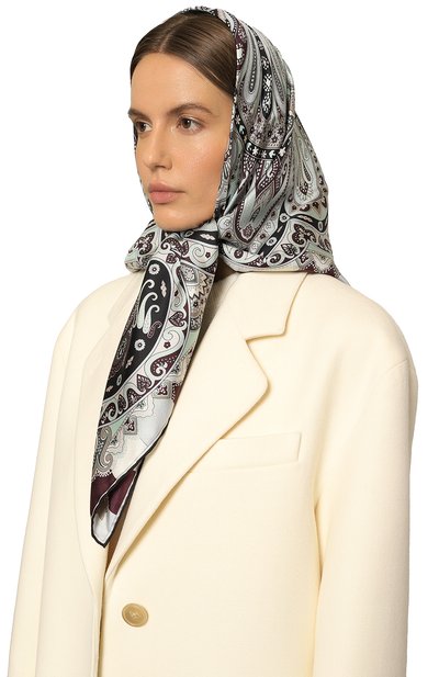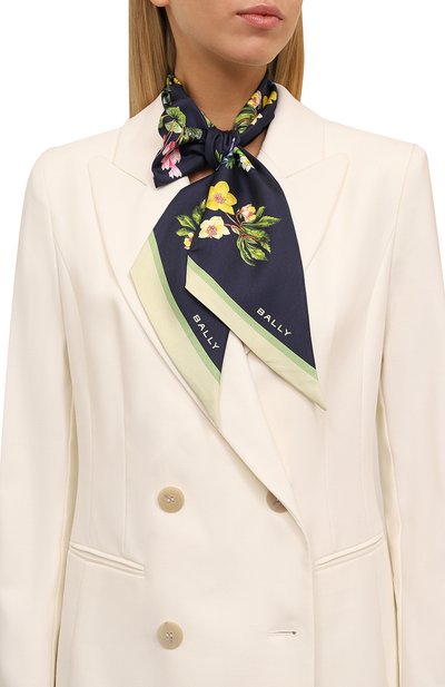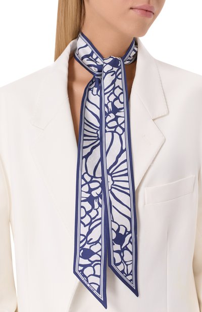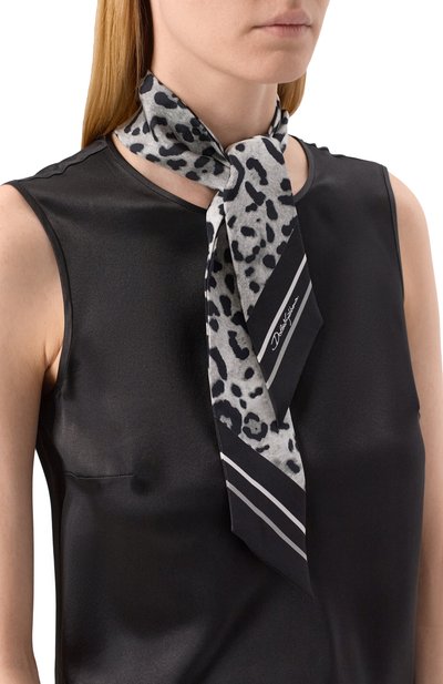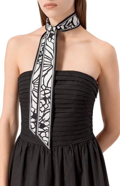 Шарф Jessie со скошенными краями выполнили из органического шелка. В слегка размытом контрастном принте на модели обыграли логотип марки.