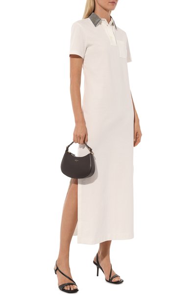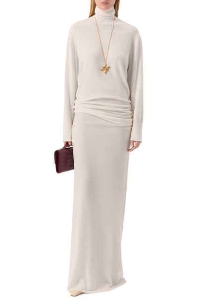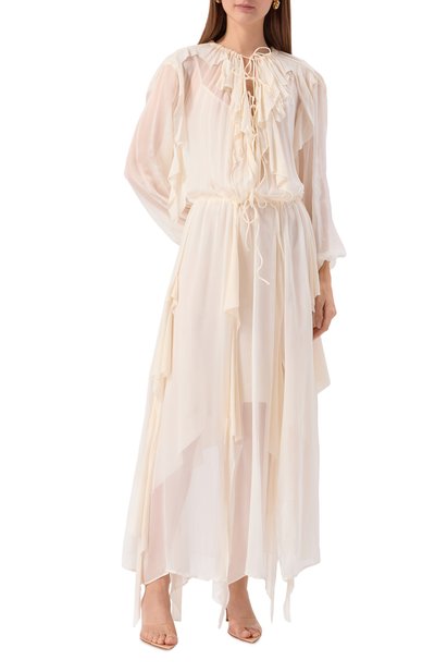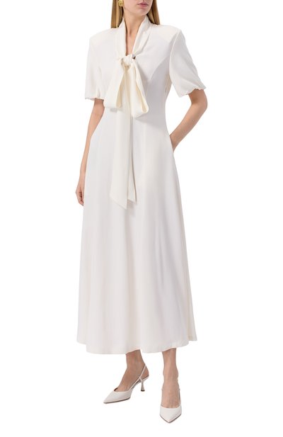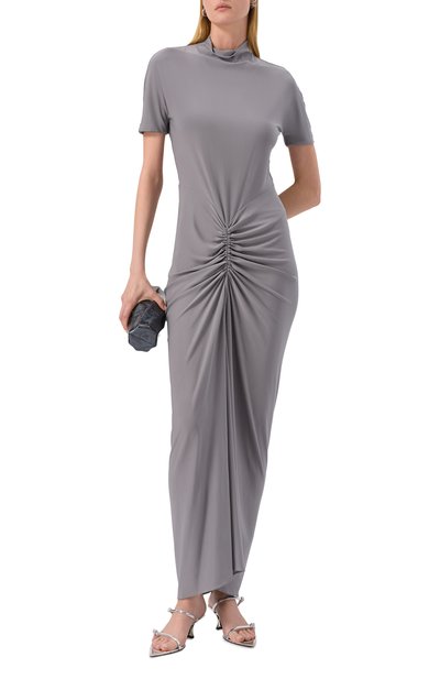 Мини-платье сшито из струящегося шелкового атласа. Лиф-бюстье с вырезом в форме сердца украшен широкими драпировками. Приталенная модель застегивается потайной молнией сзади.