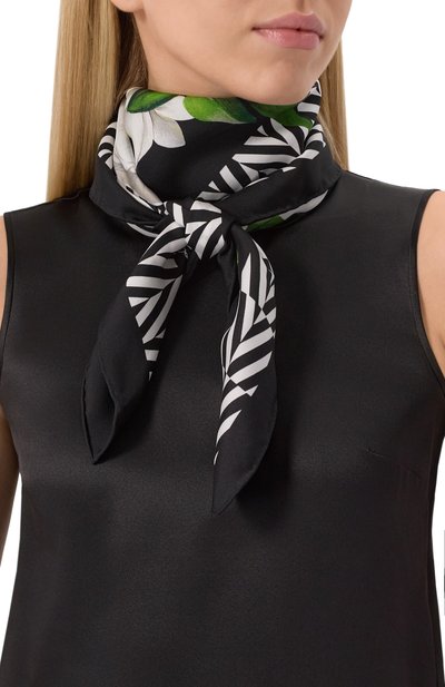 Платок с цветочным принтом можно повязать на шею или носить вместо кроп-топа. Модель с однотонными полосами вдоль подшитых краев выполнили из шелкового твила.