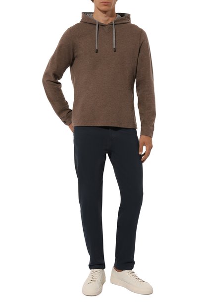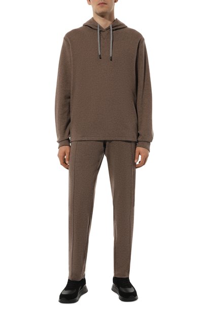 Худи из хлопкового трикотажа декорировали фирменной двухслойной пластиной с гравированным логотипом. Модель с эластичными манжетами и поясом дополнили карманом «кенгуру».
