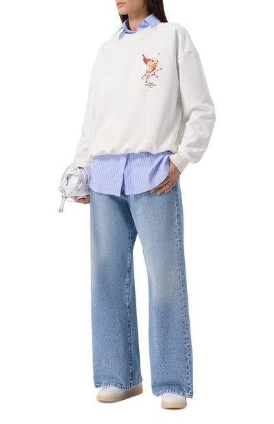 Свитшот с рифлеными манжетами, поясом и горловиной сшили из хлопкового трикотажа. Модель со спущенной линией плеч украсили контрастным логотипом спереди.