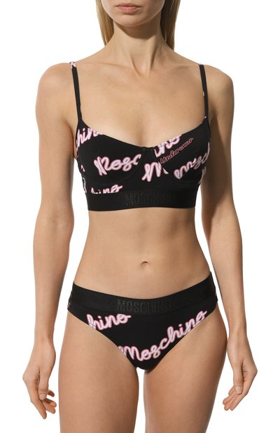 Трусы-танга с низкой посадкой и отделкой кружевом вдоль пройм выполнили из полупрозрачного эластичного тюля. Модель с вышитой сзади бабочкой украсили надписями на французском и английском языках.