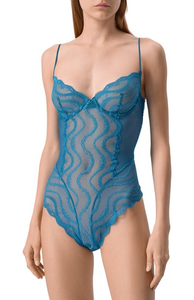 Боди Mon Cheri с регулируемыми ребристыми бретелями выполнили из эластичного кружева на основе нейлона. Модель застегивается потайными молнией и крючком сзади.