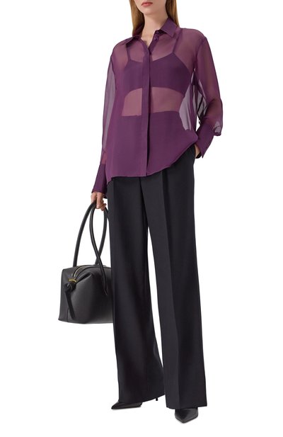 Рубашку со спущенной линией плеч выполнили из шелка с жаккардовым паттерном Handcuff. Свободную модель на глянцевых пуговицах дополнили нагрудным карманом.