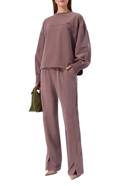 Oversize-свитшот с драпировкой на рукавах и внизу выполнили из хлопкового трикотажа с принтом Orchid Petal. Модель с круглой горловиной в рубчик составит комфортный повседневный образ с парными брюками.