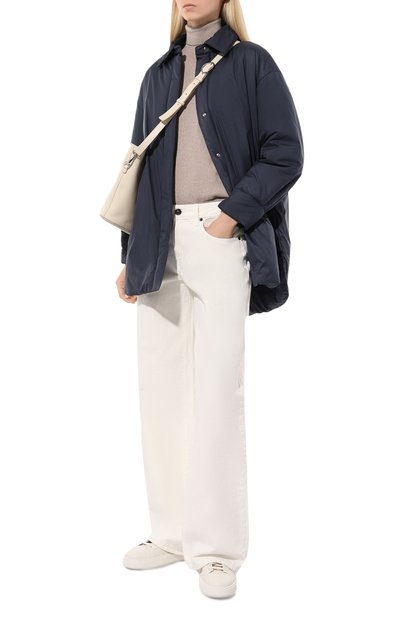 Куртку с кулиской на талии, объемными рукавами с эластичными манжетами и мелкими складками вдоль круглой кокетки выполнили из полиэстера. Модель с подолом-баллоном застегивается обтяжными и потайными кнопками.