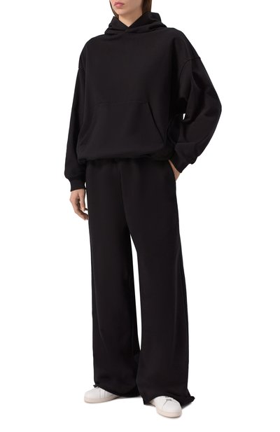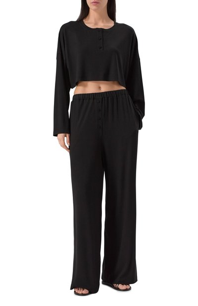 Широкие брюки с поясом-кулиской выполнили из хлопкового трикотажа. По бокам модель дополнили двумя прорезными карманами на молниях.
