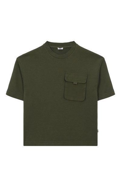 Комплект выполнили из хлопкового футера. Футболку с круглым вырезом дополнили накладным карманом из поплина. У шортов с эластичным поясом-кулиской предусмотрели два врезных кармана.