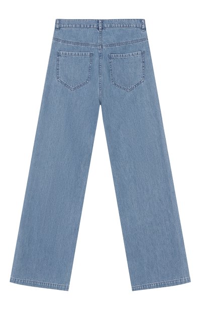 Выбеленные джинсы с боковыми и задними карманами выполнили из плотного хлопка с вышитым цветочным паттерном. Посадку свободной модели на талии можно отрегулировать эластичной лентой и пуговицами на поясе изнутри.