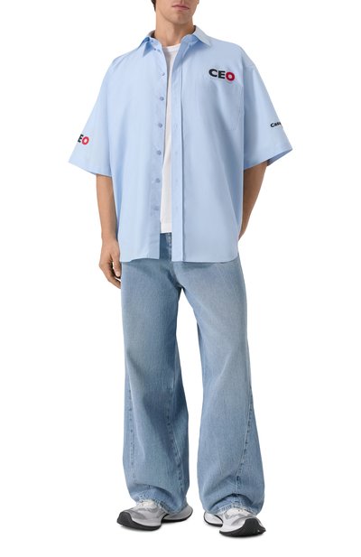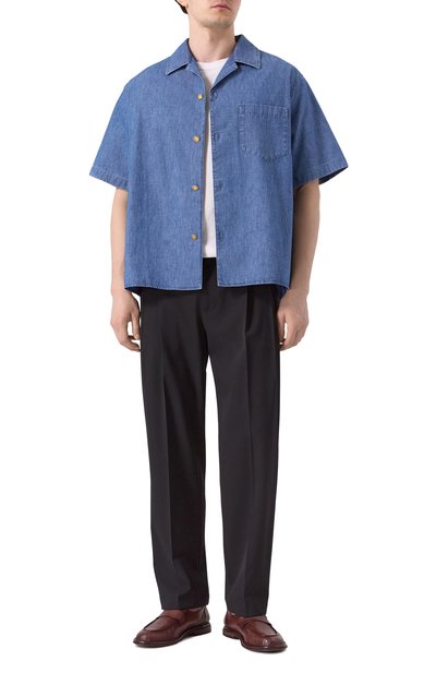 Рубашку из японского «сырого» денима на основе чистого хлопка украсили кожаным патчем с логотипом Jil Sander+ на спинке. Модель кроя oversize дополнили увеличенными нагрудными карманами, предусмотрев на левом слот для ручки.