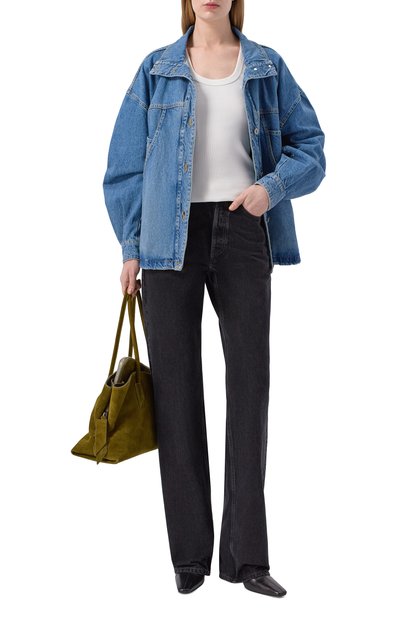 Куртку с вельветовым отложным воротником выполнили из хлопкового денима. Слегка выбеленную модель с потертостями дополнили двумя хлястиками сзади, нагрудным и парой боковых карманов.