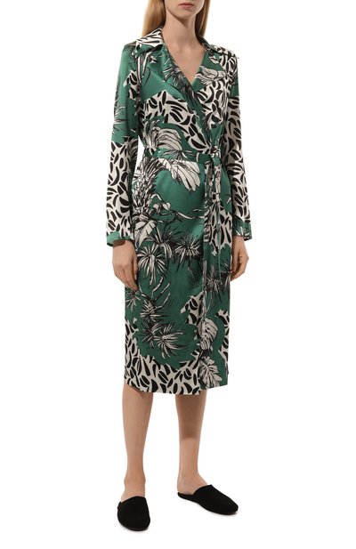 Халат с запахом, застегивающимся пуговицей, сшили из стрейчевого шелкового атласа. Модель с поясом-лентой украсили контрастным кружевным кантом вдоль V-образного выреза и на манжетах.