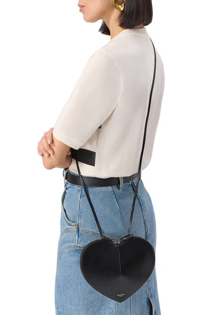 Круглую сумку с плоским внешним карманом изготовили из глянцевой телячьей кожи. Аксессуар на молнии дополнили регулируемым плечевым ремнем из текстильной ленты.