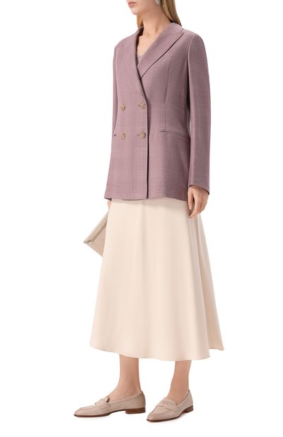 Жакет с шелковистым подкладом выполнили из шерсти. Модель со шлицей сзади и двумя широкими клапанами по бокам застегивается брендированными пуговицами.