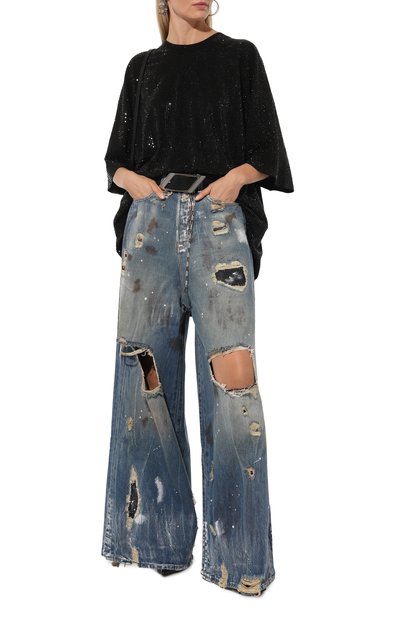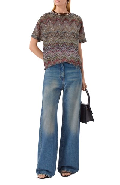 Футболку прямого кроя выполнили из фактурного вискозного трикотажа. Фирменный зигзагообразный узор подчеркнули металлизированными нитями и пайетками. Модель с круглой горловиной гармонично дополнит повседневный гардероб.