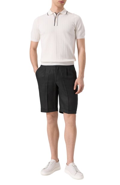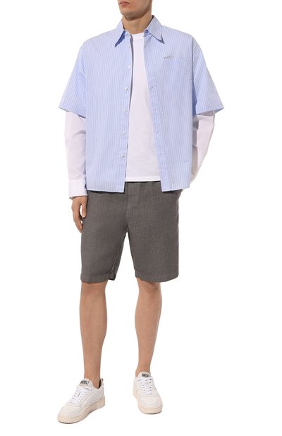 Шорты с декоративной ширинкой сшили из жатой ткани на основе хлопка и полиамида. Модель дополнили эластичным поясом с потайной кулиской, а также боковыми и задним прорезными карманами.