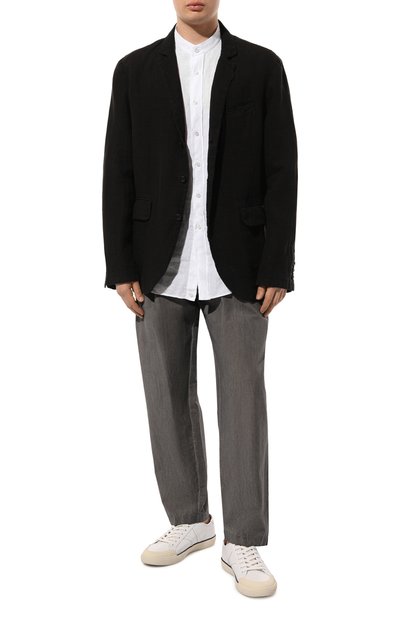 Брюки выполнили из жатого хлопка с добавлением нейлона. Широкую модель с регулируемым поясом-кулиской и защипами спереди дополнили двумя боковыми карманами.