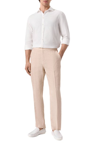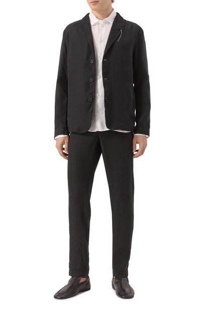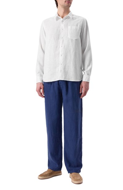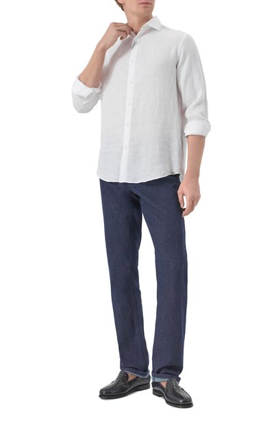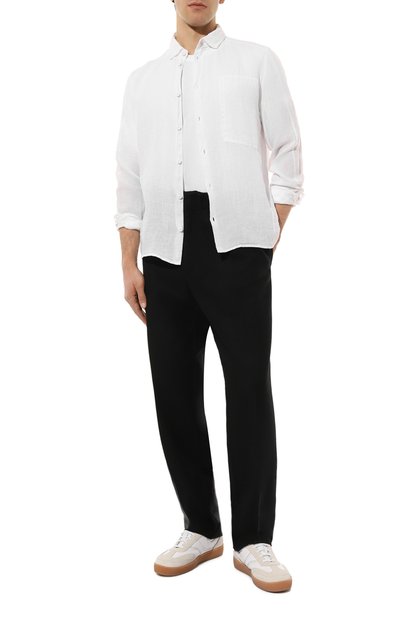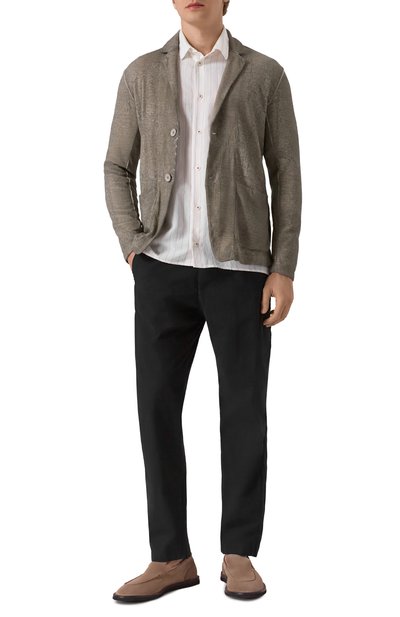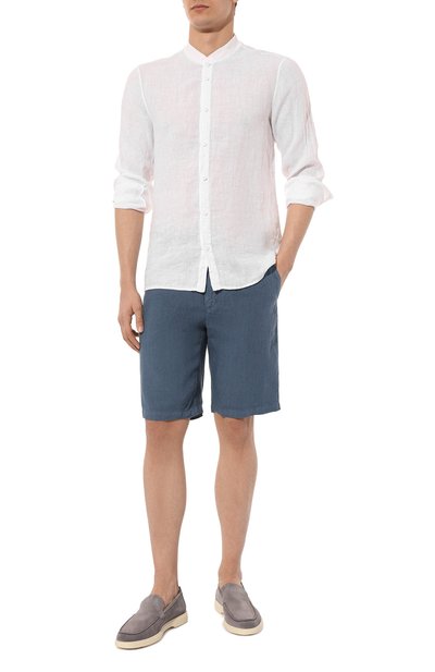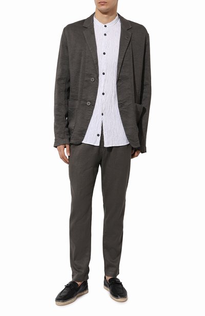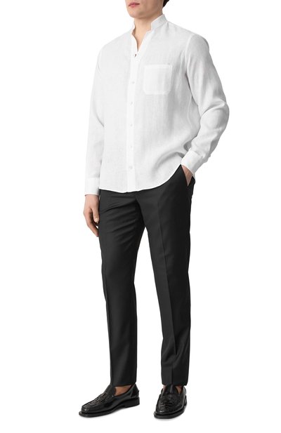 Для пошива приталенной рубашки использовали микс вискозы, хлопка и полиамида в полоску. Модель с воротником-стойкой органично впишется в образ с брюками, бомбером и кедами.
