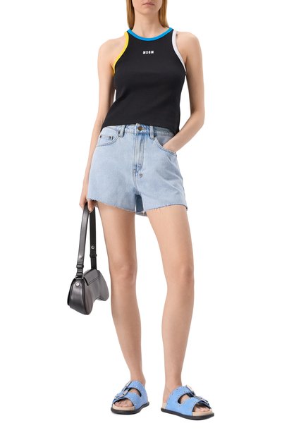 Полупрозрачный топ Seshy с ажурным узором связали из вискозы с добавлением хлопка. Слева модель дополнили накладкой в виде логотипа бренда.
