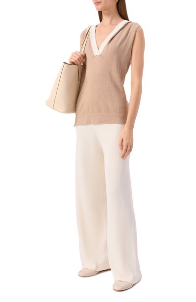 Брюки с эластичным поясом в рубчик выполнили из трикотажа на основе чистого кашемира. Наши стилисты предлагают сочетать свободную модель со свитером в полоску.