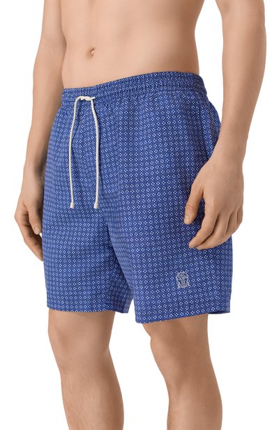 Плавки-шорты с геометрическим паттерном выполнили из полиэстерового сирсакера с добавлением нейлона. Модель с эластичным поясом-кулиской дополнили тремя карманами, один из которых декорировали логотипом.
