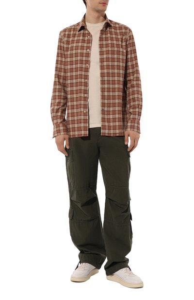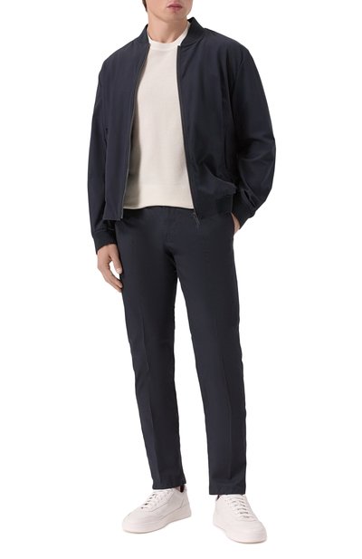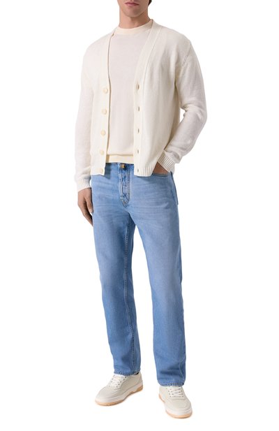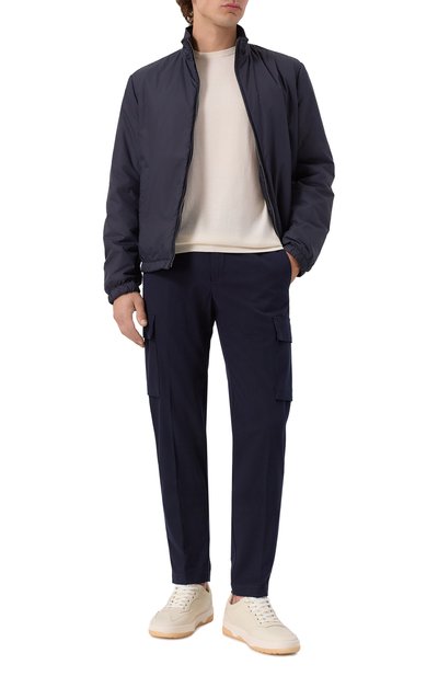 Связанный гладью джемпер дополнили рифлеными манжетами и горловиной, продублированными трикотажным кантом. Лаконичную модель связали из хлопковой пряжи.