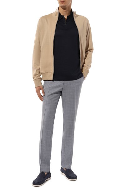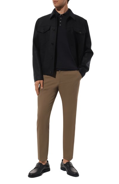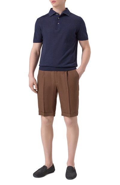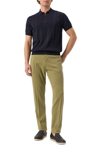 Поло с V-образным вырезом выполнили из фактурного шелкового трикотажа. Модель с манжетами и поясом станет альтернативой футболке или рубашке в casual-образе.