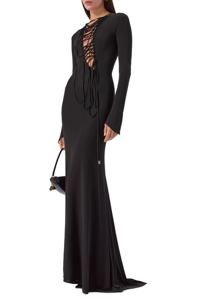 Длинное платье с высоким разрезом и потайной молнией сзади выполнили из эластичного крепа на основе лиоцелла. Такую же фактурную ткань использовали для создания объемной цветочной композиции на лифе.