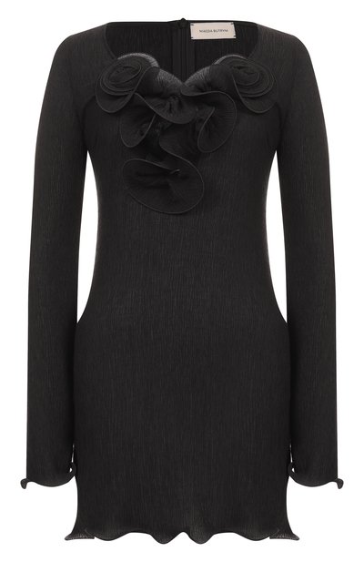 Короткое платье на потайной молнии сзади выполнили из мятого крепа на основе лиоцелла и полиэстера. Волнистые края облегающей модели поддержали объемной цветочной аппликацией на лифе.