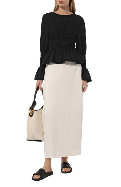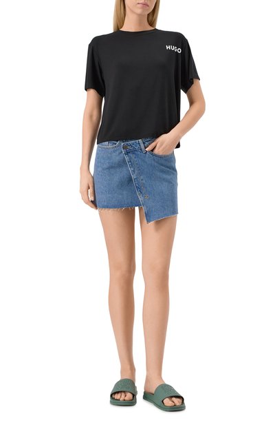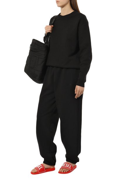 Шлепанцы на широкой подошве украсили логотипом и изображением тотемного орла. Широкую перемычку модели из полимера дополнили текстильной внутренней отделкой.