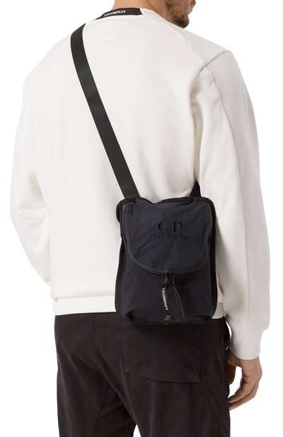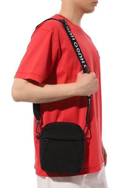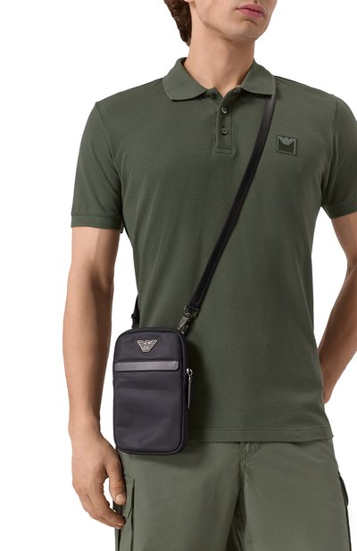 Сумку с внешним и внутренним карманами на молнии выполнили из переработанного нейлона. Спереди аксессуар коллекции Armani Sustainable Values с текстильным брендированным ремнем украсили металлической эмблемой в виде тотемного орла.