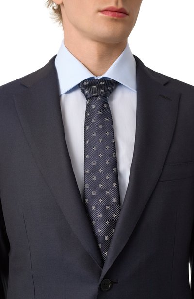 Галстук с контрастным горохом на фоне жаккардового узора выполнили из тутового шелка. Особенно гармонично аксессуар будет смотреться с однотонными классическим костюмом и сорочкой.