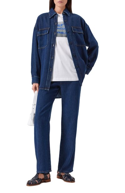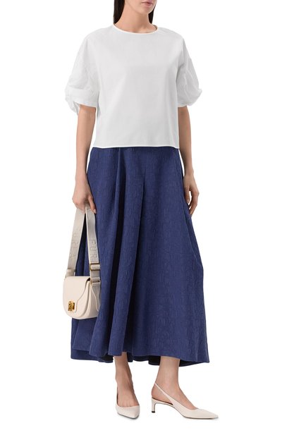 Укороченную футболку из линии Armani Sustainability Values украсили фирменным тотемным орлом из миниатюрных стразов. Для пошива модели со спущенной линией плеч выбрали хлопковое джерси.